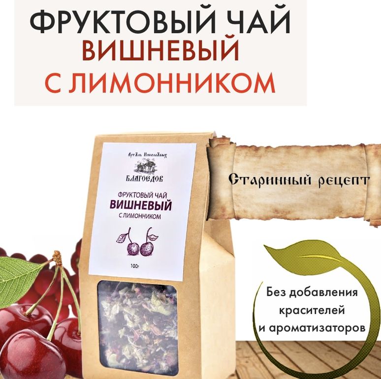 Наш фруктовый чай — это напиток, приготовленный из смеси сушёных листьев вишни и лимонника.
