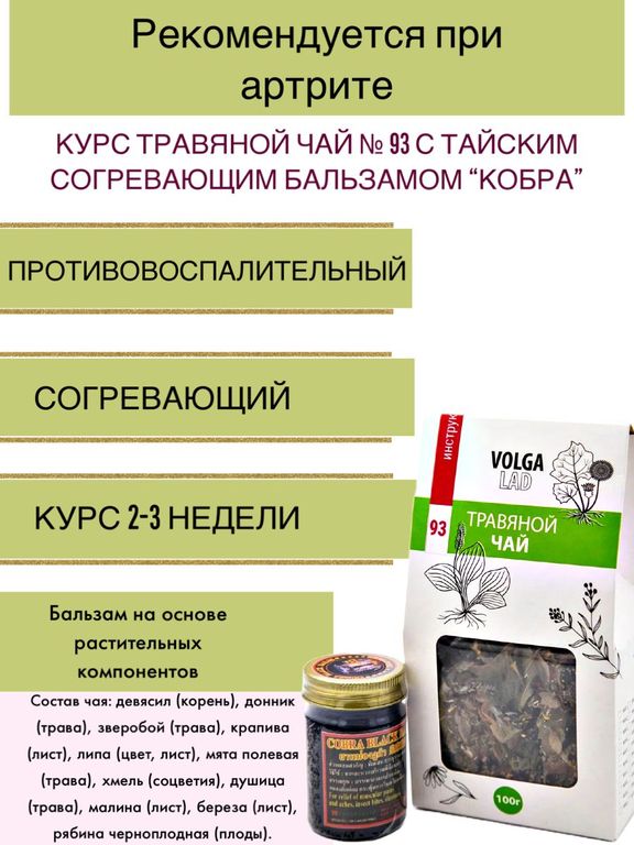 Травяной чай №93 девясил (корень), донник (трава), зверобой (трава), крапива (лист), липа (цвет, лист), мята полевая (трава), хмель (соцветия), душица (трава), малина (лист), береза (лист), рябина черноплодная (плоды).