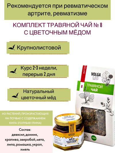 20% Добавить в избранное Убрать из избранного Артикул: чай8-70+м-цветочный-140 В наличии: 100 Артикул: чай8-70+м-цветочный-140 В наличии: 100 Травяной чай Волгаладь № 8 с цветочным медом, лечебный комплект, 70/140 г 1 090 ₽ В корзину В корзину При артрите и ревматизме При артрите и ревматизме Описание Характеристики Вопросы и комментарии 0 Описание СоставТРАВЯНОЙ ЧАЙ ВОЛГАЛАДЬ № 8, «РЕВМАТИЧЕСКИЙ АРТРИТ, РЕВМАТИЗМ» смотреть описание>>>МЕД НАТУРАЛЬНЫЙ ЦВЕТОЧНЫЙ, 140 Г смотреть описание>>> Характеристики Вид комплект Количество товаров в комплекте 2 шт Вопросы и комментарии 0 Добавить Поделиться