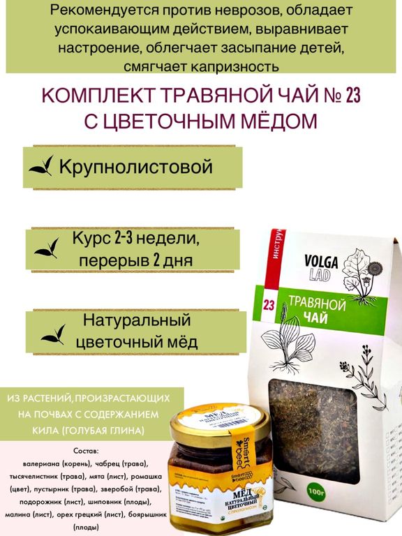 20% Добавить в избранное Убрать из избранного Артикул: чай23-70+м-цветочный-140 В наличии: 100 Артикул: чай23-70+м-цветочный-140 В наличии: 100 Травяной чай Волгаладь № 23 с медом цветочным, лечебный комплект, 70/140 г 1 090 ₽ В корзину В корзину Рекомендуется против неврозов, обладает успокаивающим действием, выравнивает настроение, облегчает засыпание детей, смягчает капризность. Рецепт ДМН академика Селезнева О. Г. Рекомендуется против неврозов, обладает успокаивающим действием, выравнивает настроение, облегчает засыпание детей, смягчает капризность. Рецепт ДМН академика Селезнева О. Г. Описание Характеристики Вопросы и комментарии 0 Описание СоставТРАВЯНОЙ ЧАЙ ВОЛГАЛАДЬ № 23, «ПРОТИВ НЕВРОЗОВ» смотреть описание>>>МЕД НАТУРАЛЬНЫЙ ЦВЕТОЧНЫЙ, 140 Г смотреть описание>>> Характеристики Вид комплект Количество товаров в комплекте 2 шт Вопросы и комментарии 0 Добавить Поделиться