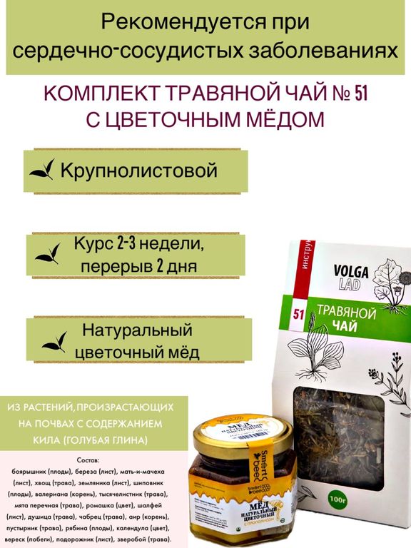20% Добавить в избранное Убрать из избранного Артикул: чай51-70+м-цветочный-140 В наличии: 100 Артикул: чай51-70+м-цветочный-140 В наличии: 100 Травяной чай Волгаладь № 51 с медом цветочным, лечебный комплект, 70/140 г 1 090 ₽ В корзину В корзину При сердечно-сосудистых заболеваниях При сердечно-сосудистых заболеваниях Описание Характеристики Вопросы и комментарии 0 Описание СоставТРАВЯНОЙ ЧАЙ ВОЛГАЛАДЬ № 47, «СЕРДЕЧНО-СОСУДИСТЫЙ» смотреть описание>>>МЕД НАТУРАЛЬНЫЙ ЦВЕТОЧНЫЙ, 140 Г смотреть описание>>> Характеристики Вид комплект Количество товаров в комплекте 2 шт Вопросы и комментарии 0 Добавить Поделиться