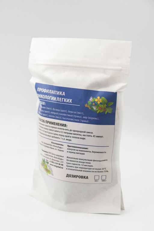 Действие: сбор оказывает целенаправленное противоопухолевое действие с поддержанием функции легких. В состав сбора входят противоопухолевые, антитоксические, иммуномодулирующие, бронхолитические и антиоксидантные травы. Чай способствует торможению фиброгенеза и эффективному очищению легких и бронхов от токсинов и продуктов распада опухоли. Устраняет сухой кашель и отдышку, обладает противовоспалительным, спазмолитическим и успокаивающим действием.